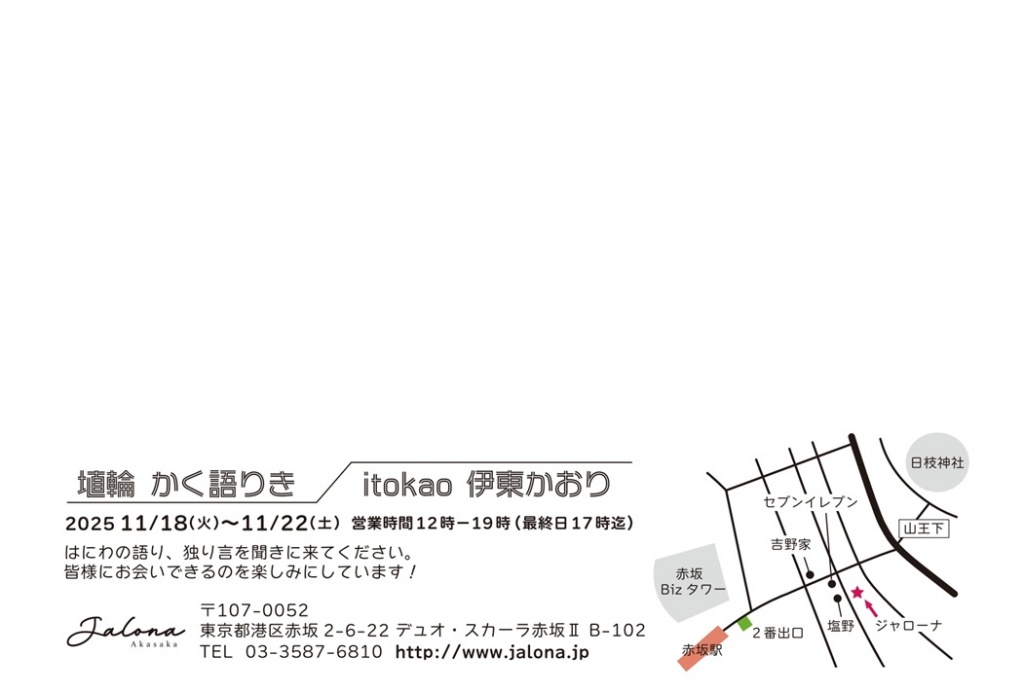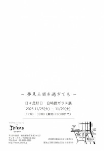 - 夢見る頃を過ぎても – 日々是好日 白﨑摂ガラス展 2025.11.25(火)~11.29(土) 同時開催 長谷川博一陶芸展 2025年11月13日 長谷川博一 陶芸展を同時開催しています。 ガラスと陶芸、どちらも作家の「好き」を詰め込んだ展示ですので是非ご覧ください。